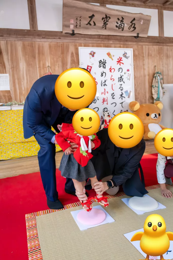 飯盛神社で七五三は何度か撮影してきましたが、お餅踏みは初めての撮影。神楽殿はお餅踏み用にセットアップしてあり、巫女さんも慣れた感じで進行してくれます。ただ神楽殿は狭いので距離が取れず画角に収めるのに苦労しました。