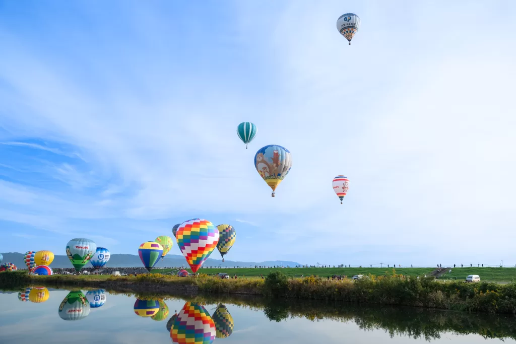 川の対岸の撮影スポットは、確かにすばらしく、朝の晴れた空に飛ぶバルーンが川面にばっちり映ってます。